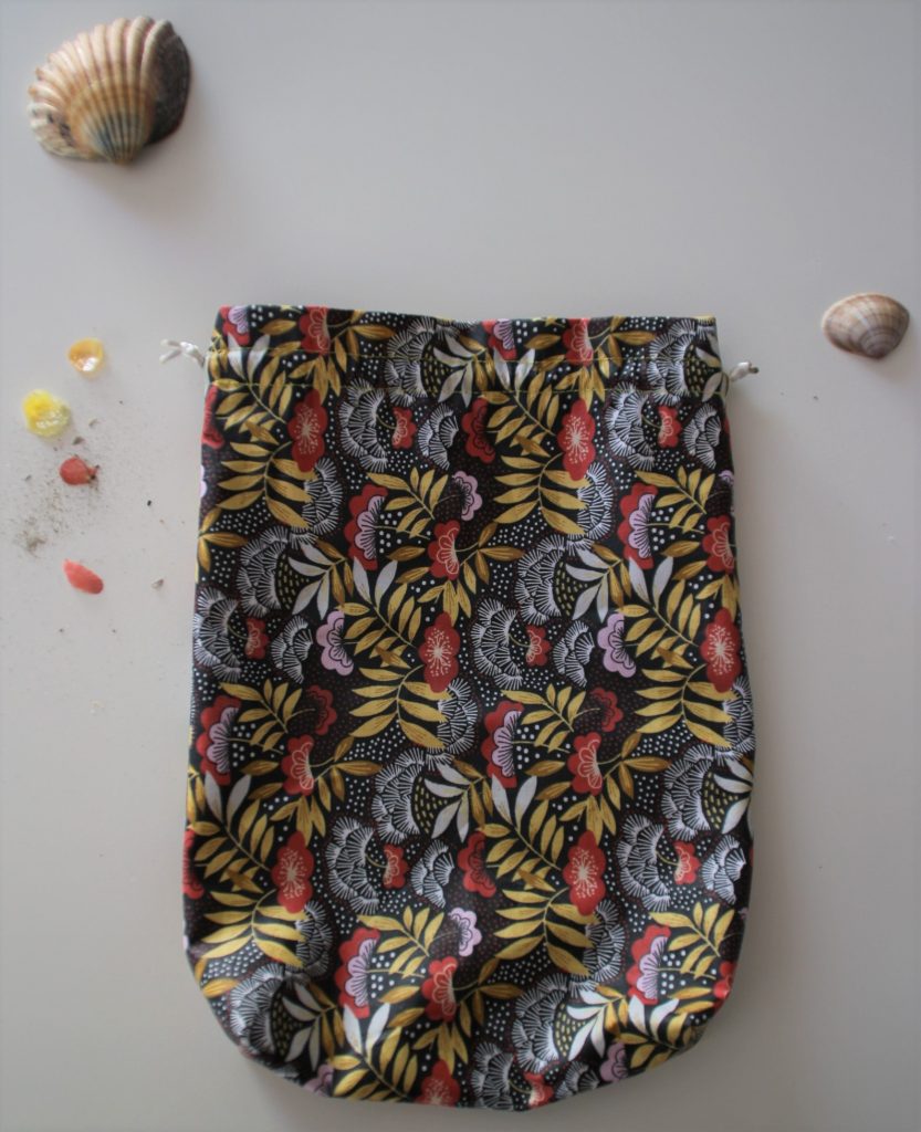 Et voilà, vous pouvez à présent être fière de ce joli pochon qui vous accompagnera à la plage pour y glisser votre petit bazar estival : crème solaire, maillot de rechange, lunettes de soleil…