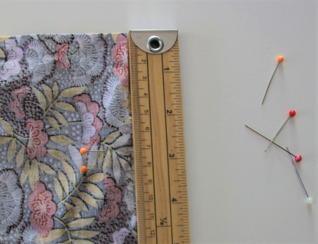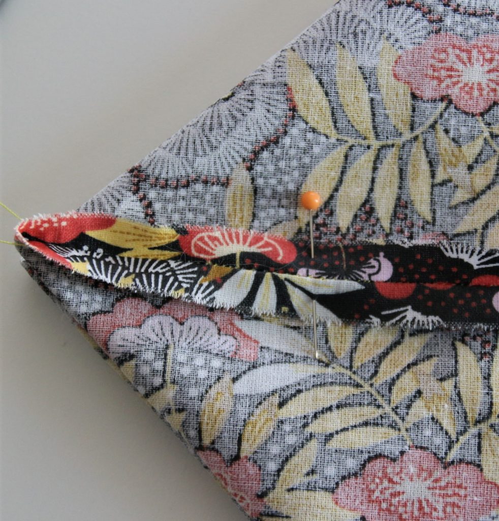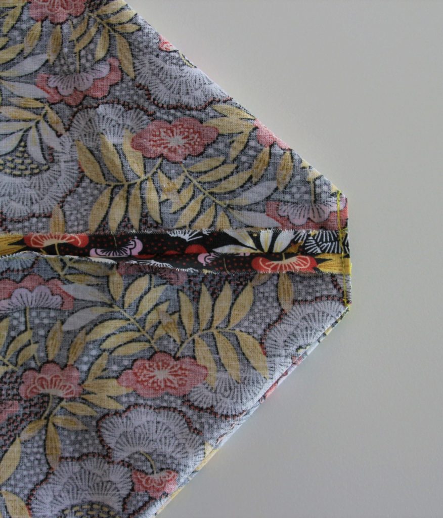 Si je veux faire un « soufflet » au fond du pochon, il me suffit de plier les angles du fond en deux afin de former deux triangles, les épingler et coudre à 2 cm pour un soufflet de 4 cm.